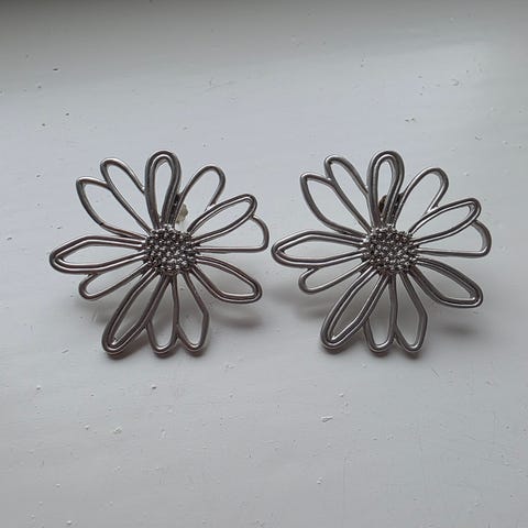 Aidot hopeiset nappikorvakorut Avonilta, ostettu joskus vuosien 2008-2010 tienoilla. Erinomaisessa kunnossa, ehjät, en näe mitään näkyviä käytön jälkiä. Halkaisija ~ 1 cm. Elegantit hopeiset kukkakorvakorut kimaltelevilla kivillä.