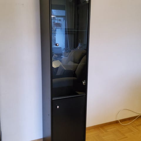 Hyvin toimiva, tukeva, kuultovalkoinen vitriinikaappi. Pientä kulumaa ja käytön jälkiä löytyy, mutta yleisilmeeltään siisti. Edellisen omistajan asentamat valot yläreunassa. Verhot eivät tule mukaan. Malli Ikean Granemo. Kaappi valmiiksi purettu.