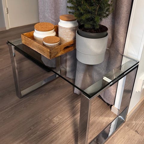 Siro lasinen apupöytä, joka sopii vaikka kannettavan tietokoneen alle tai eteiseen tasoksi. Kokonsa puolesta kompakti, mutta silti jämäkkä valinta.