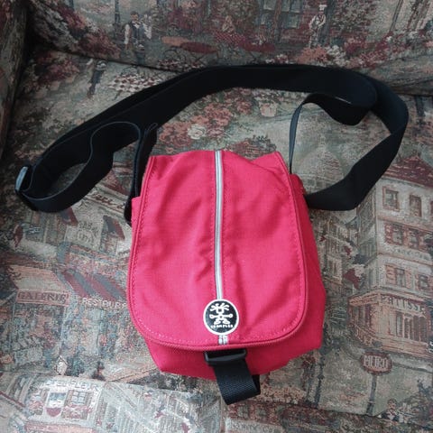 Punainen, pieni 3 litran kameralaukku. Voi käyttää olkalaukkuna, cross body bag, vyölaukkuna. Mahtuu kännykkä, lompakko, point and shoot kamera ja taskuihin pieniä tavaroita. Tähän saa mahtumaan myös pienen peilittömän järkkärin esim pannarilinssin kanssa. Käytetty vain pari kertaa koska oma kamera 24-70mm linssillä ei adapterin vuoksi mahdu.