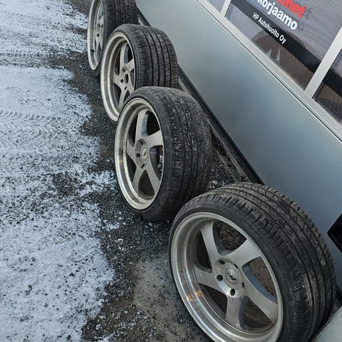 Siitä lähtis ylimääräiset vanteet iteltä lojumasta, etuset oli muistaakseni 8.5" leviät ja takana 9.5" renkaat vaihtokunnossa nii niille en laske yhtään arvoa, edessä menee vielä hetken ja takana on finaalissa, yhdessä takavanteessa pieni halkeama joka näkyy kuvissa, pietti ilmoja sillon ko oli itellä alla mutta pikkuhiljaa tyhjenee kuitenkin, olisi hyvä hitsata, vanteet oli hetken itellä e61 alla ja siihen istuu 16mm lättyjen kanssa ja edellisellä oli e46 alla. Kulkeutuu mukana tarvittaessa Rovaniemelle.