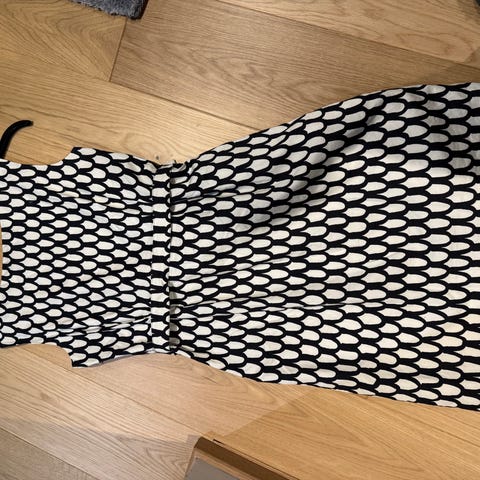 Mustavalkoinen vuorillinen kaunis mekko, oikein hyväkuntoinen. Kai-kai n. 54 cm ja ol-hel n. 102 cm.