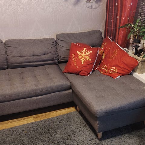 Kulmasohva harmaasta kankaasta valmistettu. Sopii olohuoneeseen tai oleskelutilaan. Kolmiosainen sohva, jossa irrotettavat tyynyt ja metalliset jalat. Tuosta kolmos osasta on lisätuki syystä kun, on rikki niin tarvii tuon lisätuen. Sekä sohvan tyynyistä lakana kangas sekä istuimein että makuun ovat kaikki pesty kun ovat irrotettavia helposti. Lisää kysyttävää tai muuta olkaa yhteydessä kiitos tervetuloa.