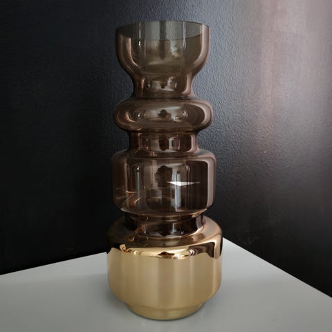 Hieno sininen kullattu maljakko, jossa paljon kultausta. Korkeus 26cm, halkaisija 13cm.