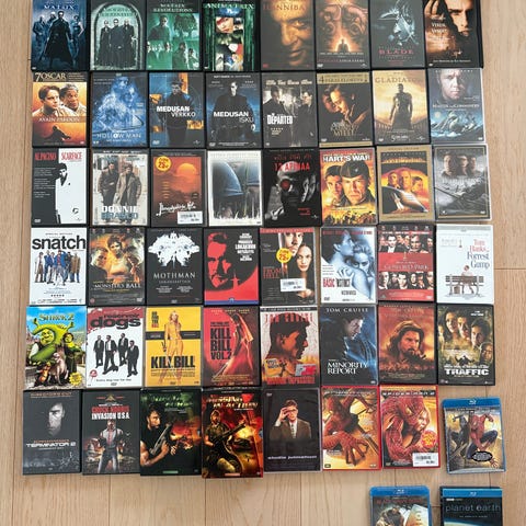 Läjä kaikenlaisia leffoja yms. Sovitaan paketti hinta halutulle setille. Kaikki hyvässä kunnossa. Noin parisataa.