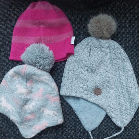 Viisi pipoa, kolmet villahousut vaaleat on venyvät ei käytetty ja yhdet lapaset. Päänympärys n. 45-52