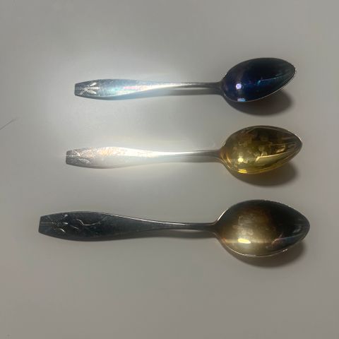 Myydään kaksi eleganttia, vanhanaikaista teelusikkaa, joissa on kaunis ruusukuviointi.
