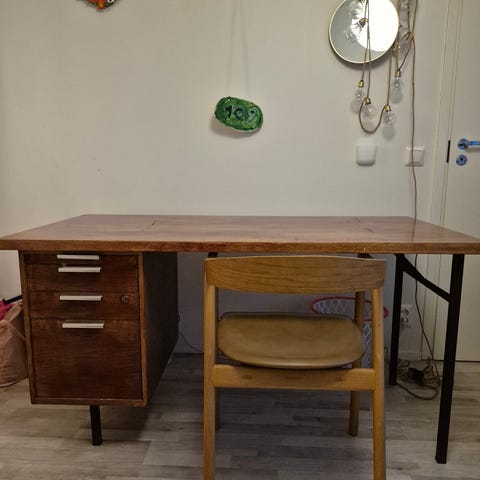 70-luvun alussa teetetty vintage työpöytä ja hyllykkö. Nouto Espoon Olarista.