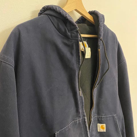 Tehosteena valkoiset vetoketjut edessä ja taskuissa, valkoinen Carhartt-brodeeraus rinnassa. Kauluksessa, hihansuissa ja helmassa resorit.