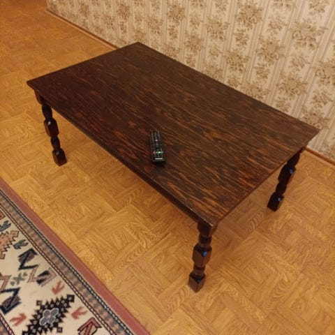 Pöytä jonka kannessa on kolhuja.