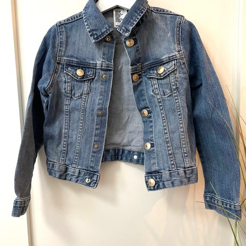 Hyväkuntoinen lastenfarkkutakki, jossa miehustassa helmikoristeita. Valenapit, eli helposti kiinnilaitettava nepparikiinnitys.