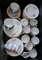 Myytävänä hyväkuntoinen, ehjä puna-harmaa posliiniruusukalusto. Kahvikuppeja 18 kpl, asetteja, pullalautasia, sokerikko ja kermakko. Lisäksi samanvärinen 3 kuppia toista sarjaa.