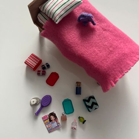 Nukketaloon menevä pöytä ta tuolit, juomapullot, lasit, astiat, aterimet, paistinpannu ja ruokaa.