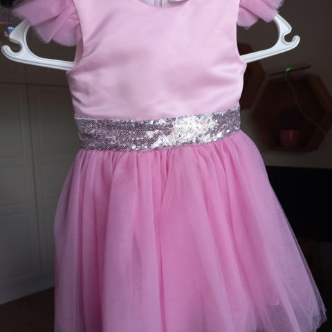 Erittäin kaunis juhlamekko pehmeää samettia, syvän violetin värinen. Rinnassa koristeellinen vaaleanpunainen nauha. Takana napillinen kiinnitys. Koko 92, sopii hyvin noin 1,5–2-vuotiaalle. Näyttää upealta, kangas on miellyttävä iholla, ja mekko on erinomaisessa kunnossa.