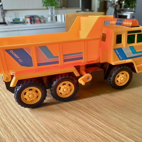 Myydään seuraavalle pienelle ihmiselle iso kuorma-auto kippi-ominaisuudella. Vain sisällä leikitty ja ollut lähinnä tilaa viemässä kaapissa. Kevyesti rullailee ja kiva kuljetella vaikka aarteita :)