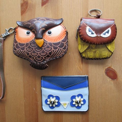 Kolme käyttämätöntä pöllö-aiheista kankaista kukkaroa / pussukkaa.