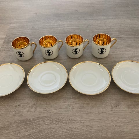 Kuusi Arabian Fenno-mokkakuppia tasseineen (lautasten pohjassa merkintä 12-69). Malli OC. Design Greta-Lisa Jäderholm.