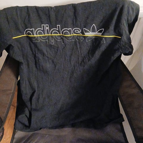 Myydään musta Adidas Originals T-paita Materiaali 92% polyesteriä ja 8% elastaania, joustava ja hengittävä kangas. Klassinen Trefoil-logo edessä ja olkapäillä kolmiraitayksityiskohdat. Paidassa on käytön jälkiä, etupuolella näkyy pieniä tahroja ja logopainatus on osittain halkeillut. Muuten ehjä ja käyttökelpoinen vaate arkeen tai treeniin.