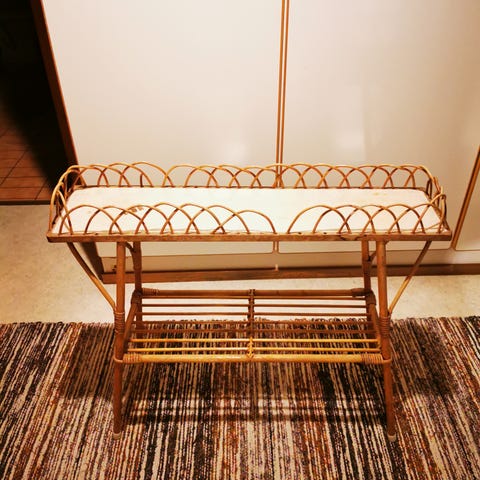 Myyntiin kuvien designharvinaisuus, Aarikan vintage kukkataso / kukkapöytä. Tämä on Aarikan edustajan mukaan joko prototyyppi tai vaihtoehtoisesti niin lyhyen aikaa tuotannossa ollut malli, ettei tästä löydy mistään Aarikan mallistoista mainintaa.