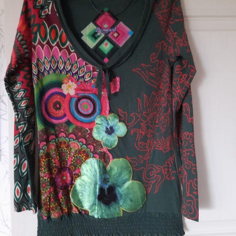 Desigual pusero naisille, koko M. Vihreä väri ja koristeellinen kuviointi edessä. Pitkät hihat ja pyöreä pääntie. Sopii monenlaisiin tilaisuuksiin. Uusi.