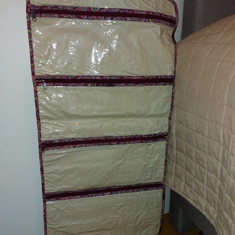 Kuten kuvista näkyy, siinä on rengas, jota Voi roikottaa ettei tavarat mene likaiseksi ja pysyy siistinä vetoketju suljettuna. Joten kylpyhuoneeseen myös kaapissa oiva säilytyspaikka oveen esim.