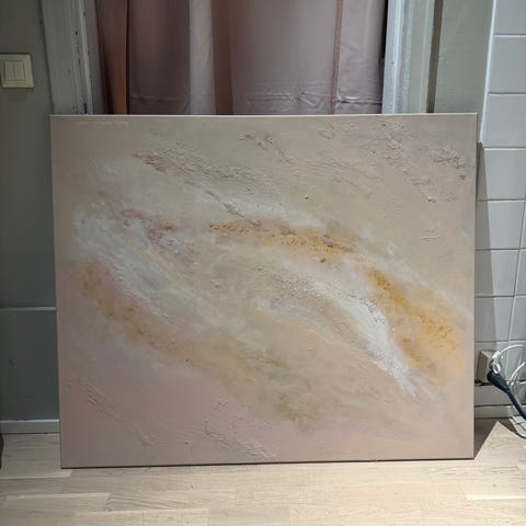 Merja Honkalan akryylityö "Valkopukuinen". Työn korkeus on 54 cm ja leveys 22 cm. Kehys 62 X 30 cm.