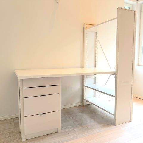 Täydelliseen Hillan Stenlundin suunnittelemaan Lundia Classic -kokonaisuuteen sisältyy työskentelytaso sivupöydällä, seinäkiinnittelinen kaapisto sekä laatikoston vetolaatikoilla ja renkailla.