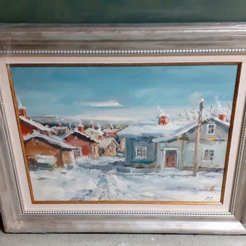 Pertti Pylkkönen "Lauantai-broileri saapuu" öljyväri kankaalle mitat kehysten päältä korkeus n.92cm leveys n.112cm kuva-ala n.80x100cm