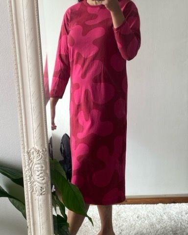 Upeassa kunnossa säilynyt Marimekon klassikkomekko, 100% puuvillaa. Kokolapussa on merkintä 160. Mitat: pituus niskasta helmaan 92cm, leveys kainalosta kainaloon 48cm.