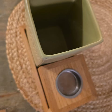 Ruskeat kultaisilla kuvioilla. Lasia. Ostettu aikanaan kynttiläkutsuilta, merkistä ei tietoa. Maljakon suulta värjäys vähän kulunut.