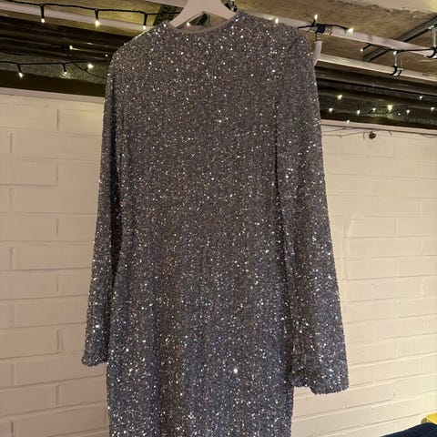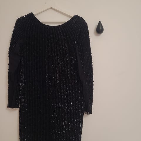 Kauniin tummansininen kokonaan paljeteilla verhoiltu mekko. Erittäin joustava vuori, tosimiellyttävä päällä, ei pistele. Lyhyt helma vähän polven yläpuolelle, pitkät hihat.