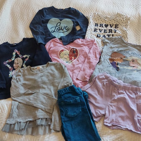 Tummansiniset collegehousut, Frozen tekstillä sekä "kalansuomu" terenauhat lahkeiden sivulla. Pieni reikä toisen puntin alareunassa ( kuvassa). Sininen sydänkuvioinnilla oleva pitkähihainen t-paita, paidan väri hieman haalistunut. Ehjä ja tahraton. Vaatteissa kokomerkintä 116 cm, mutta vastaa enemmänkin kokoa 110 cm. Postitus postituskulut lisäten hintaan tai nouto Inkoosta. Maksu MobilePay tai käteinen. Myös toridiilillä.
