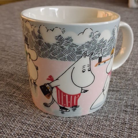 Kuvanmukainen uusi ja käyttämötön Muumimuki Talven ihmeet, 2022. Tarra paikoillaan.