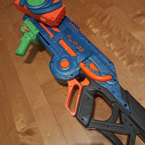 Iso Nerf-konekivääri, kaikki 15 panosta rullassa. Itse lisätty kantonauha. Tampere Tammela, kulkeutuu kävelyetäisyydelle. En postita
