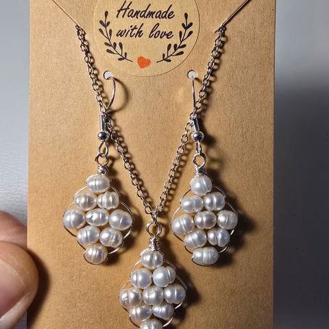 Myydään uusi upea hopeinen käsityönä tehty makeavedenhelmi korusetti korvakorut + kaulakoru. Korvakorun koukku ja ketju ovat 925 hopeaa.