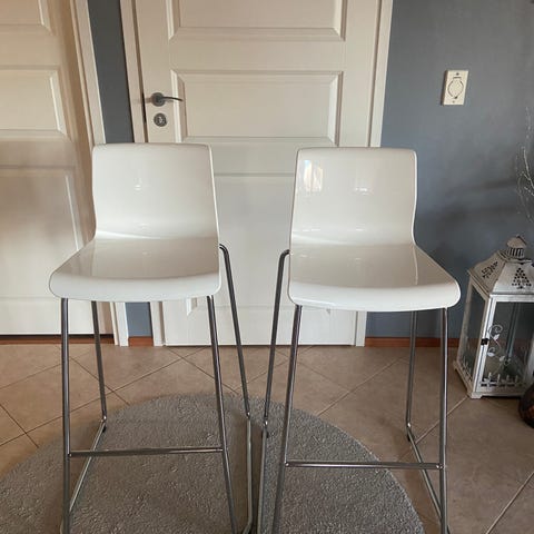 Suomessa tehdyt valkoiset baarituolit aitoa nahkaa. Lisäksi 5kpl uusia ulkotulppia. Käytön jälkiä ja vähän tummentumaa reunoissa. Istuinosan halkaisija 30cm ja jalkatuen leveys 38cm. Tuolin jalkojen muutamat tulpat ovat halkeilleet ja niitä on vaihdettu.