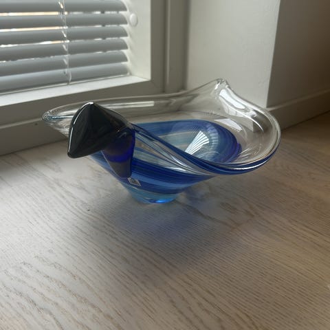 Kuvan mukainen lasiteos. Leveys 22 cm ja maljan pituus 24 cm, paino 1327 g. Lasiruusu Oy.