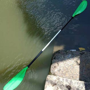 Linkin mukainen pituussäädettävä mela. Tuli minulle käytettynä, eikä ole päätynyt edes testiin (kun ei päätynyt kajakkikaan...), on kuitenkin saanut täällä säilytyksessä läheisen kovakouraisessa kohtelussa halkeamaa toisen pään putken päähän. Vaatii siis vahvistusta tai lyhennyksen, että varmasti kestää kovemmankin käytön. Muu kuluma vain pintanaarmua.