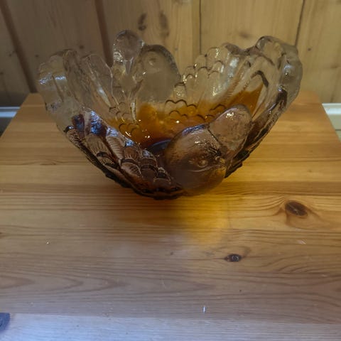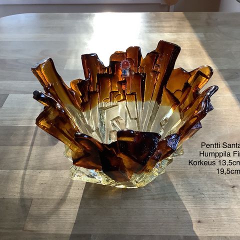 Humppilan lasin taidelasikulho. Leveimmältä kohdalta 23 cm, korkeus 4,5 cm.