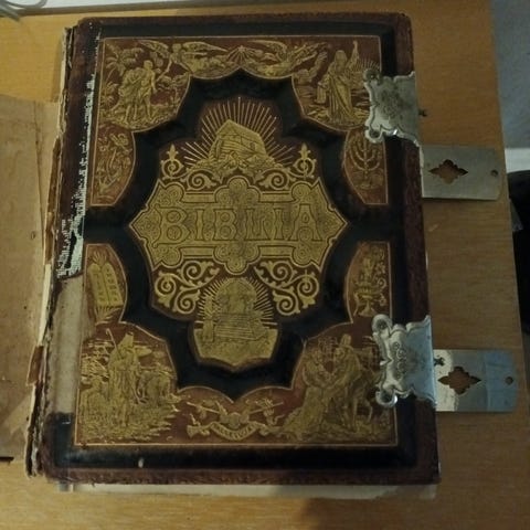 Valitettavasti sivuja puuttuu eikä raamattu ei ole kehuttavassa kunnossa, mutta on sillä jo ikääkin.