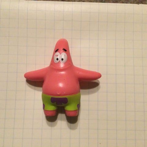 Paavo Pesusienestä tuttu hahmo Patrik. Saa roikkumaan imukupilla. Täytetty muovisella hileellä.