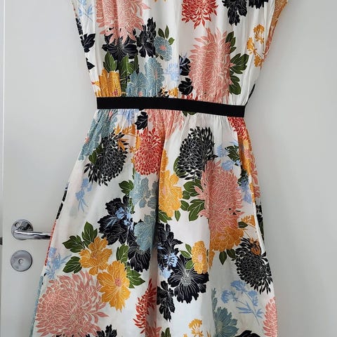 Vaaleanvihreä kukkamekko. Mekossa ei ole koko- eikä materiaalilappua, mutta arvioisin sen olevan kokoa M.