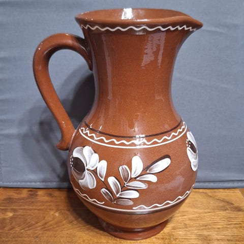 Hedelmillä ja kukilla kuvioitu iso kannu.Monikäyttöinen. Kaunis koristeena.Nouto.Korkeus 22 cm ja leveys max 21.