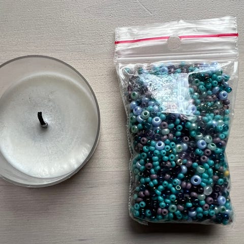 Myydään sydän helmi. Tuikku havainnollistamassa helmen kokoa. Omat askartelut ovat olleet pidemmän aikaa jo tauolla, jonka vuoksi myyn itselleni tarpeettomina.