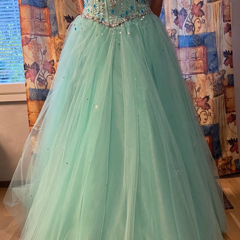 Myydään kerran käytetty uudenveroinen vihreän sininen glitteri paljettinen vanhojentanssimekko. Mekon koko on M.
