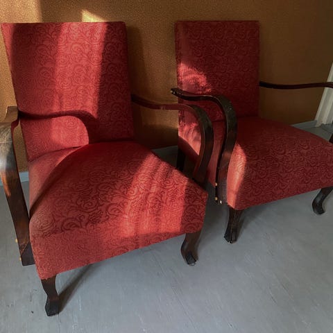 Heti valmiit käyttöön Ilmari Lappalaisen Askolle suunnittelemat Columna tuolit . Tuolit on verhoiltu joskus 70-luvulla. Tuolin kiinnitys runkoon siipiruuveilla.
