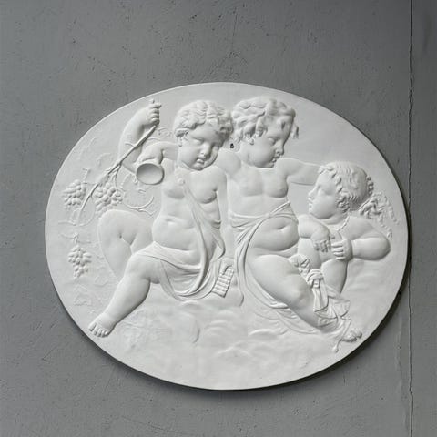 Myydään vanha äiti–lapsi -aiheinen seinäreliefi.