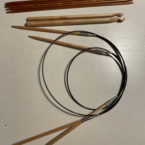 Neulelankoja, virkkauslankoja, 60cm:n pyöröpuikot 2,5, 3,0 ja 3 1/2, nelosen sukkapuikot ja pitkät puikot 5 1/2 mm. Osa langoista puretuista töistä, osa uusia. Lankoja n. 2kg.