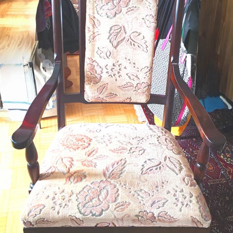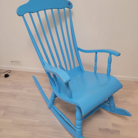 Pieneen tilaan mahtuva jousikeinutuoli. Käsinojan päissä värin kulumaa. Irralliset pehmusteet. 70€/tarjous!