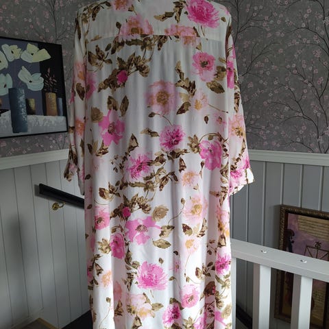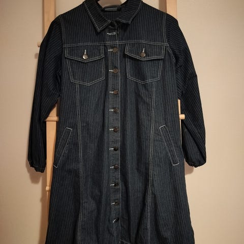 Sinikirjava Zhenzin mekko. Koko Zhenzin S, jonka ilmoitetaan vastaavan 42/44, mutta itselleni 46-kokoisena mahtuu hyvin. Kiva kietaisutyylinen leikkaus helmaosassa. Materiaali rypytettyä viskoosia. Kainalo-kainalo n. 57 cm yhtään venyttämättä, venyy. Olka-helma n. 95 cm.